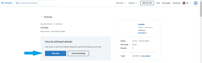 Once the owner has approved your booking, a PAY NOW button will appear at the top of the booking page.