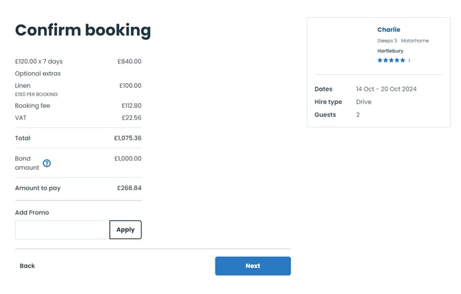 Camplify requires a 25% payment (of the total booking cost) to secure the booking. All payments are due within 72 hrs of the booking being approved, after which it will be automatically cancelled.