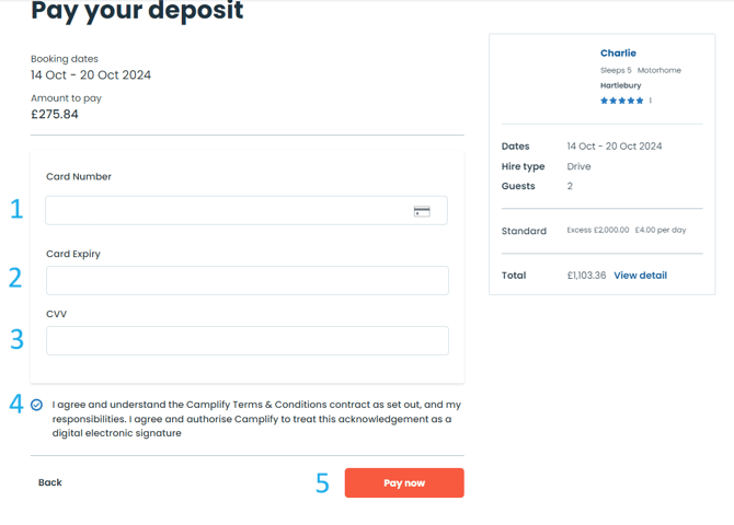Once you reach the payment step, enter your credit card details and hit "Pay now". It's highly likely you will be requested to complete a secondary security verification step with your financial institution. Once the payment has gone through, you'll receive a payment receipt via email, and the van owner will be notified that you've made payment.